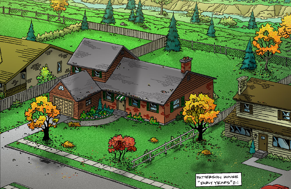 By the time the strip was published, however, we were living in Northern Manitoba in a completely different house with a very different layout. I casually began to copy the interior layout of our new house as I drew the day-to-day lives of the Pattersons—never thinking I would have to pay real attention to the architecture. When the animated shows began to take shape in the early 2000s, we had to do serious schematic drawings of the house, the school, and even the neighbourhood! These were necessary for the animators to turn 2D drawings into a 3D animated world.
