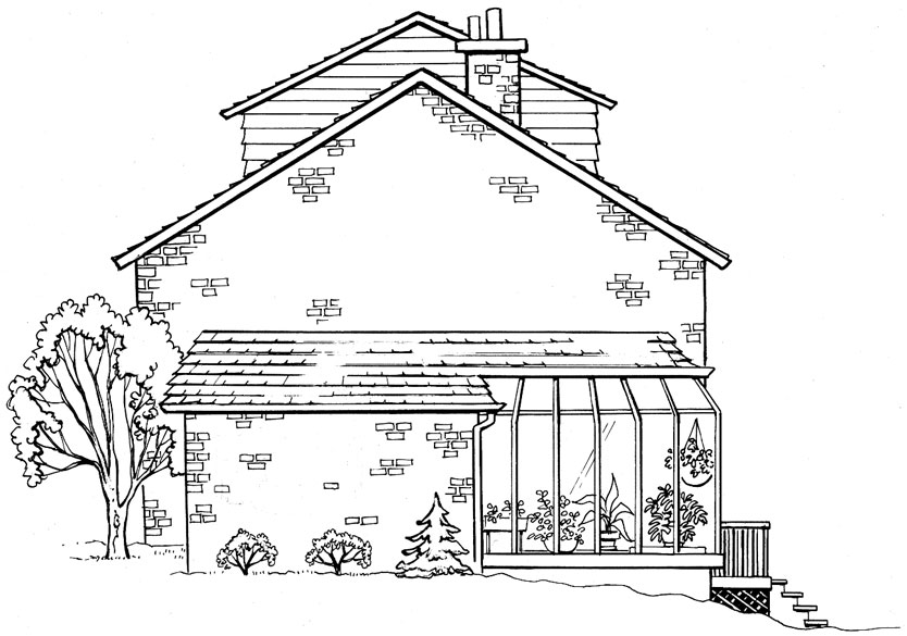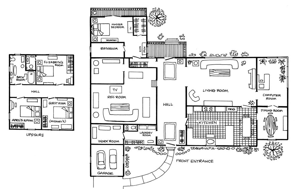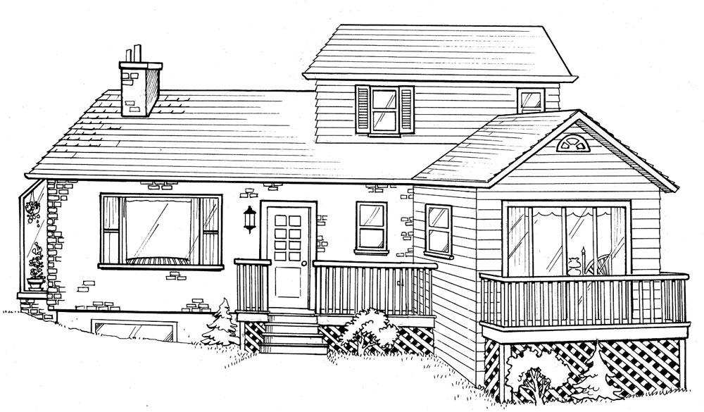 When I designed the Patterson house, I had my old house in Dundas, Ontario, in mind. The front yard, driveway, lawn and front entrance were similar. The house backed onto a ravine just like the Pattersons’ house. I copied the shuttered windows, the garage, and the brick exterior. To some degree, the house I drew was quite recognizable.