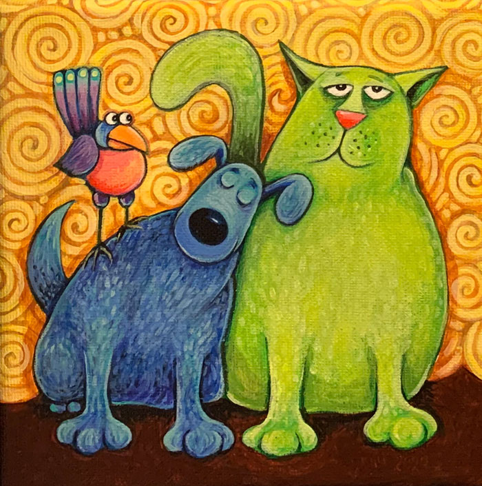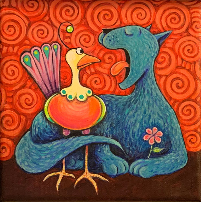 Just before we left North Bay, Ontario, I saw a sale on tiny canvases at a local art/craft shop and thought I'd take advantage. You never know when you'll need a 4X4" canvas, so I bought a bunch of them—I have friends who use them to try out new materials. I thought I'd putter about with cartoon animals in COLOUR, for a change, and these looked like a perfect size. What you'll see here are some fast experiments; some are on wood, others on canvas, and all are done with acrylic paint.