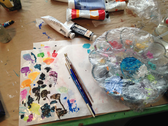 I like to use glass egg trays when I paint. The colours are kept separate. I can mix on the centre of the glass or on disposable paper mixing sheets. I use a laundry sprayer to keep the paint moist as I use it, then I cover the tray with light, plastic shower caps so nothing dries out for the next day's work. These can be found at your dollar store.