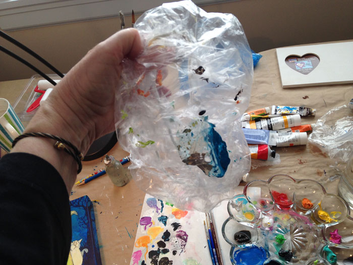 What's great about a glass palette is that acrylic paint washes right off leaving the glass completely clean—no contamination when you do the next job. Let the paint dry hard, then soak the dish in hot water. The paint will pop right off. Keep in mind that this stuff will clog your drains, so I scoop what I can out of the sink with a small strainer, then use a straining cup in the drain when I let the water out.