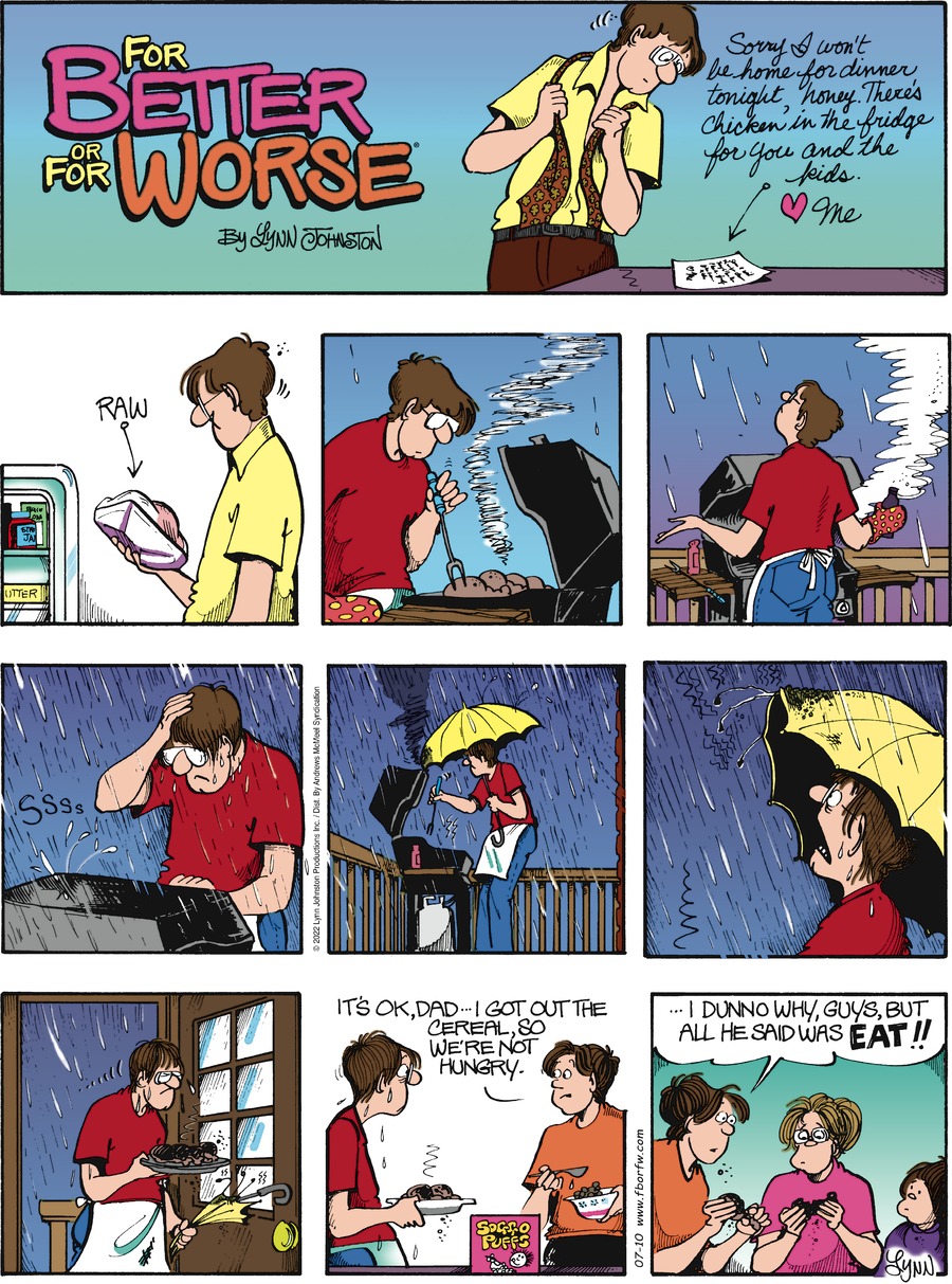 Lynn's Comments: This strip was done for a friend whose little son was so afraid of the water that he had to have all the flotation devices available before he'd go into the pool. He had the inflated arm rings, a life jacket, and when he could, he'd squeeze into an inflatable "doughnut" as well. The funny thing is, this young man is now a deep sea diver who specializes in the inspection and maintenance of underwater structures. Posts, moorings, rigs and sea walls are all part of his underwater work—quite a change from the boy who was afraid of the water! Bourton has also become a clean sea advocate. He donates many hours of his time to finding and removing "ghost nets" from British Columbia's coastal waterways. He and the others who are cleaning up our oceans and beaches are unsung heroes. The next generation is a great one!