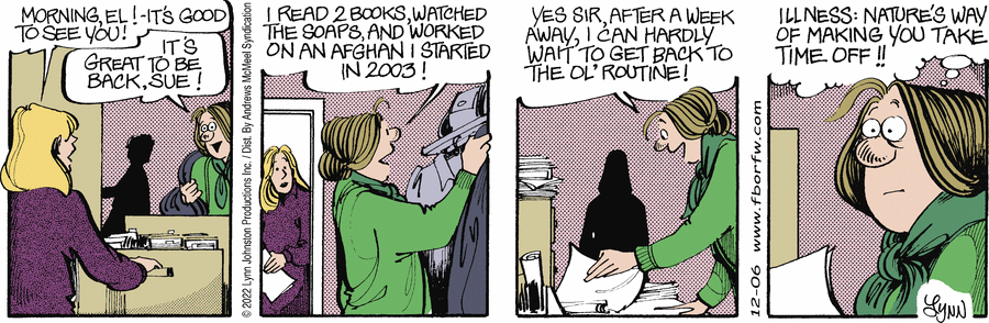 Lynn's Comments: Here is where the "inflatable nose"” is evident. Whenever I wanted to show Elly at her worst, I drew her nose larger. I didn't do this intentionally; it's what came out of my pen! Since much of the strip was based on real life, I've always been grateful that my nose remains the same size—no matter what I'm thinking.