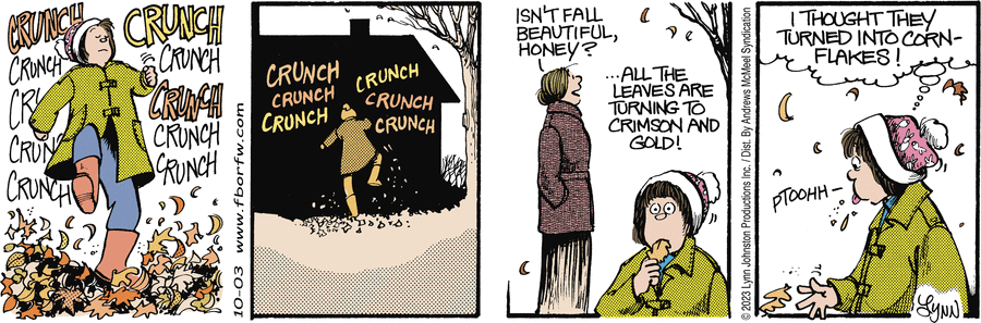 Lynn's Comments: One of the many things about Ontario that I miss is the fall harvest. Along with the spectacular fall colours were the outdoor markets with their piles of pumpkins, crates of apples, fresh veg and homemade items of all kinds. Getting the Halloween pumpkin meant a long ride in the country to a big family farm where we'd buy produce and pumpkins, ride the hay wagon, and have coffee with friends. A signature pastry the family sold from their kitchen was a raspberry turnover to die for! You haven't tasted heaven until you’ve had one of these. Reading this Sunday strip brings back all those wonderful memories.