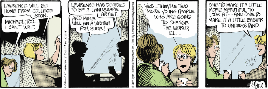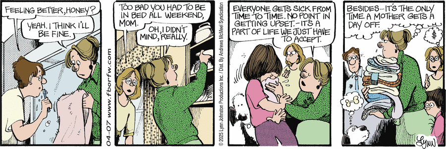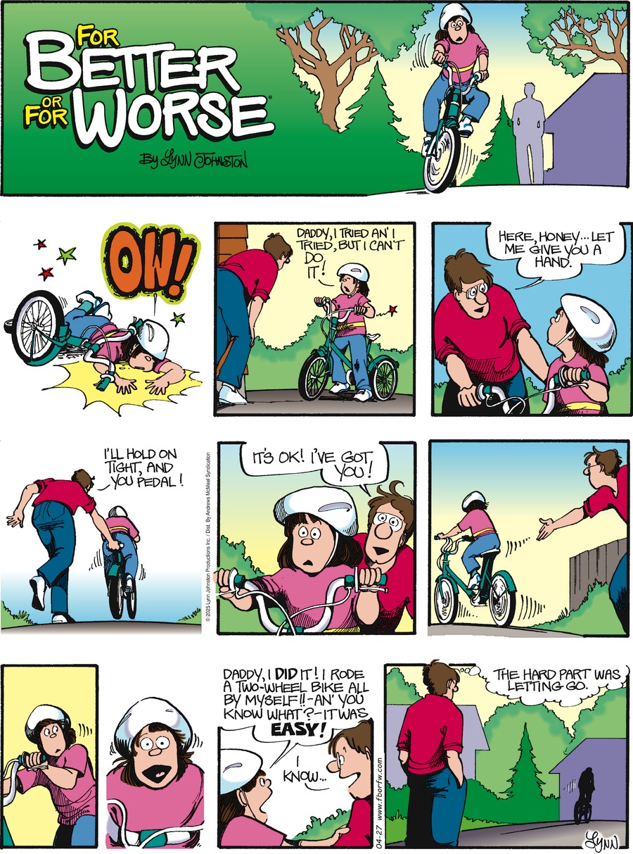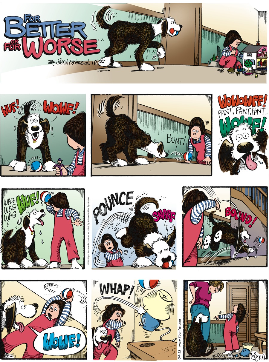 Lynn's Comments: Readers criticized April’s “kidspeak” and told me to make her use proper English. I thought it would detract from a child’s charming way of learning the language. As long as my editors were OK with the content of the strip, I left it alone. One can suffer from too much advice!